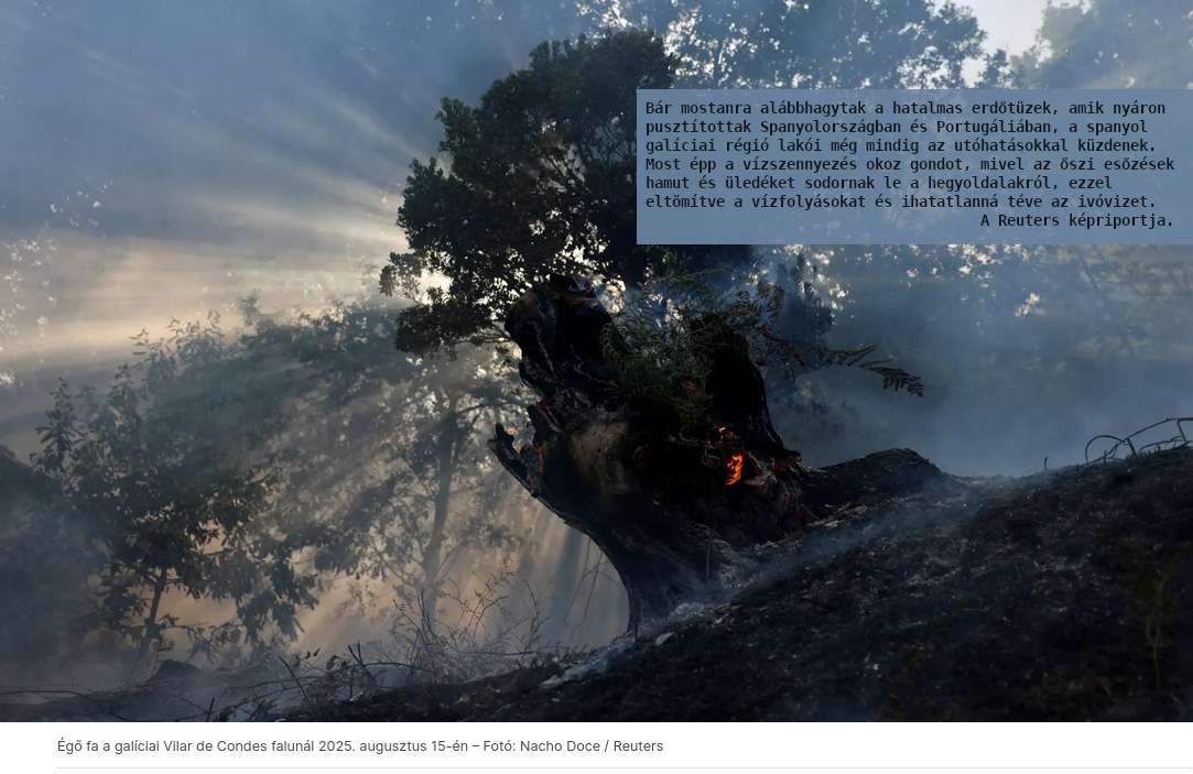 Bár mostanra alábbhagytak a hatalmas erdőtüzek, amik nyáron pusztítottak Spanyolországban és Portugáliában, a spanyol galíciai régió lakói még mindig az utóhatásokkal küzdenek. Most épp a vízszennyezés okoz gondot, mivel az őszi esőzések hamut és üledéket sodornak le a hegyoldalakról, ezzel eltömítve a vízfolyásokat és ihatatlanná téve az ivóvizet. A Reuters képriportja.